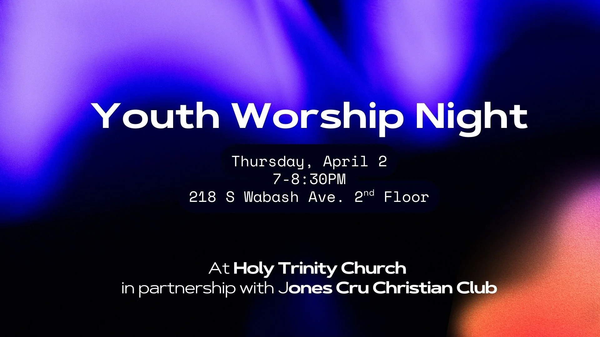 Hosted by Holy Trinity Church Youth Group, in partnership with the Cru Christian Club at Jones College Prep